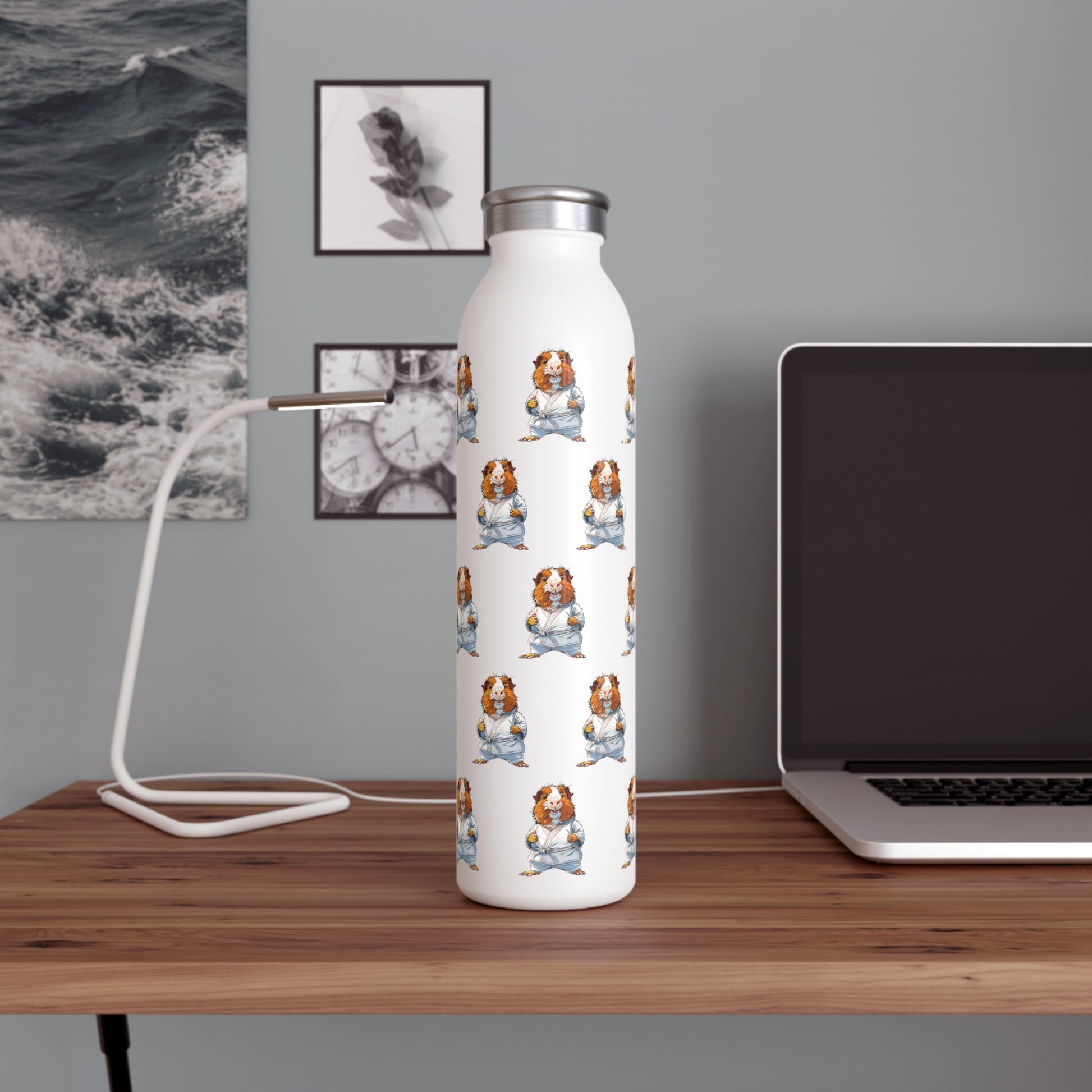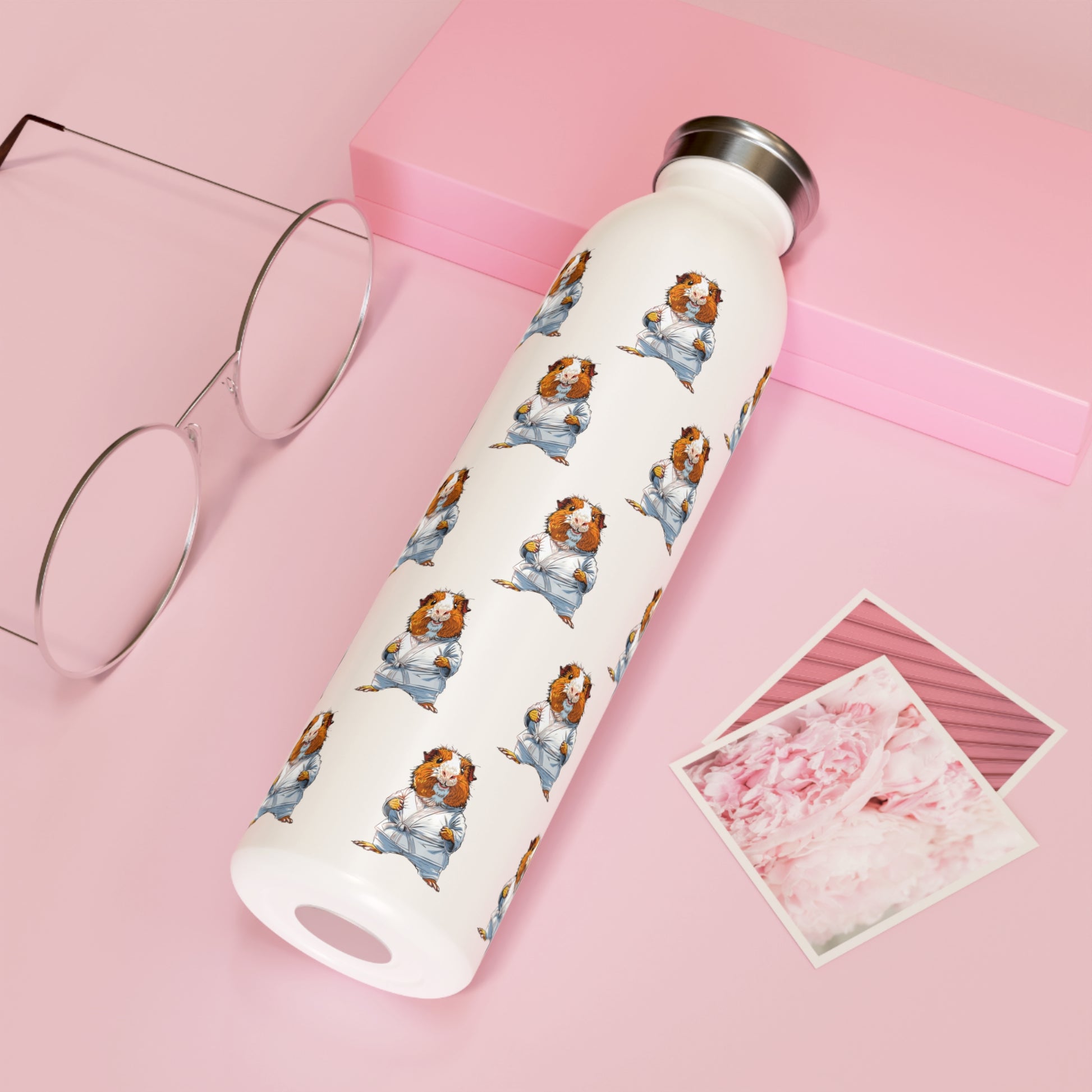 Slim stainless steel water bottle featuring a playful our adorable "Guinea Pig in Gi" pattern, bringing martial arts energy to your daily routine.